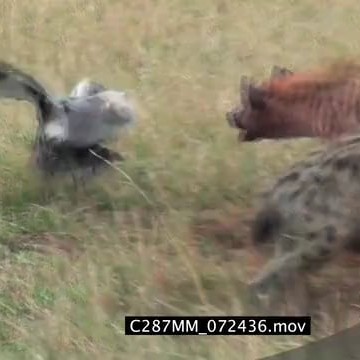 Spotted hyena clan feeding on a zebra and a white backed vulture walks towards the clan and gets chased off by the clan