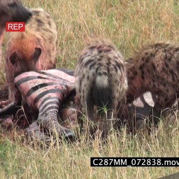 Spotted hyena clan feeding on a zebra