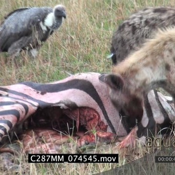 Spotted hyena clan feeding on Zebra carcass as White-backed vultures look on