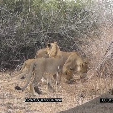 A pride of lions standing and sniffing on a dead cu killed by a lioness SHAKY