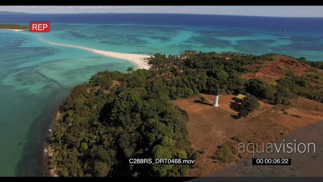 AERIAL of the Madagascar Island and a light house on the island GREEN
