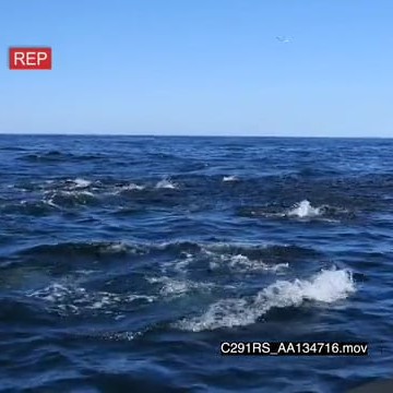 A school of common dolphins and a group of seals feeding on a bait ball of sardines, swimming and porpoising SHAKY LWS