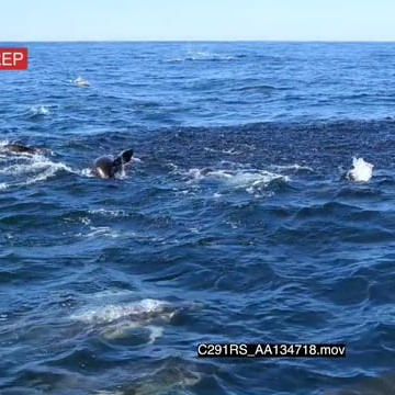 A school of common dolphins swimming and porpoising while feeding on the bait ball of sardines with a group of seals TOPSIDE SHAKY