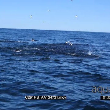 A group of seals and a school of common dolphins swimming, porpoising and feeding on a bait ball of sardine a great white shark feeding on the bait ball TOPSIDE