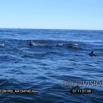 TOPSIDE a group of seals and a school of common dolphins swimming, porpoising and feeding on a bait ball of sardines