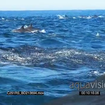 A school of common dolphin and a group of seals swimming, porpoising and feeding from the sardine bait ball TOPSIDE SHAKY GOOD LIGHT