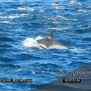 A school of common dolphins porpoising TOPSIDE TRACKING SHOT LWS
