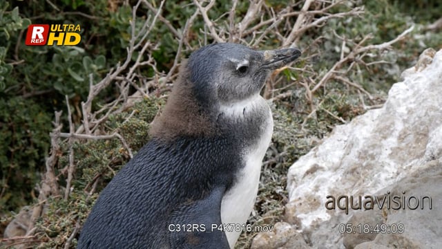 African penguin chick standing, looking around and walking out of frame.