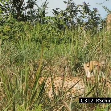 A pair of cheetahs, walking and the other one resting on tall grassland GOOD LIGHT GREEN