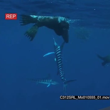 Marlin sailfish and Seals feeding on ever shrinking bait ball in deep blue ocean UW
