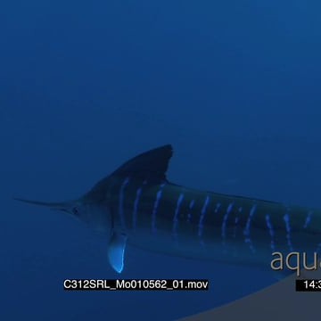 Marlin sailfish swim past in deep blue ocean UW