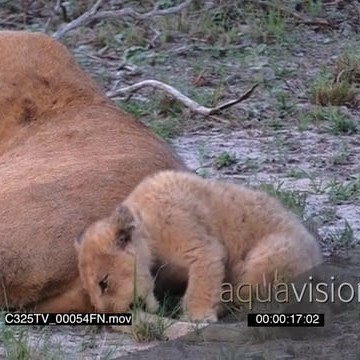 Lioness resting and grooming on cub while the other one is learning how to hunt AmCam