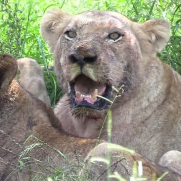 African Lion Pride sitting under the tree feeding on a kill with cubs DIRTY BLOODY