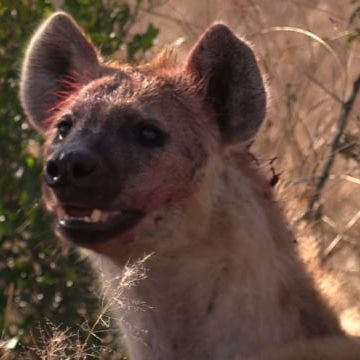 A Pair of Spotted Hyenas looking around Alert while feeding on a carcass
