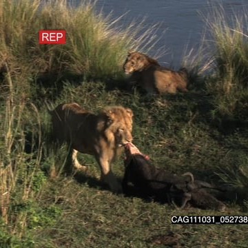African Lion dragging carcass on riverbank and Lioness laying down HA LS PAN