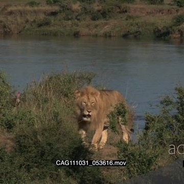 African Lion walking on bushveld and looking around LS PAN