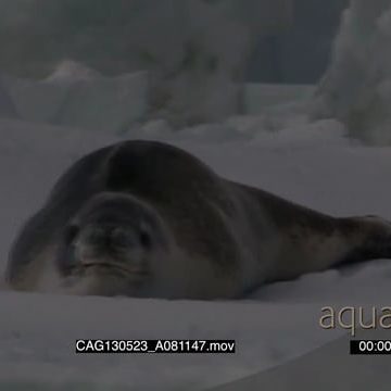 Leopard Seal laying and moving on ice in ocean WS ZI MLS HAND