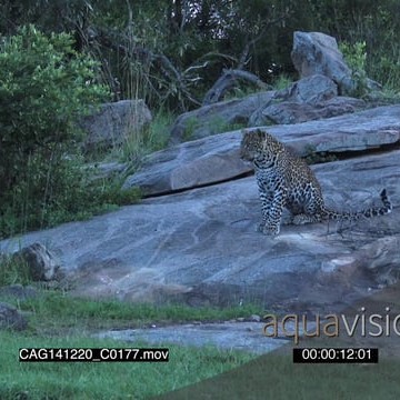 Leopard sitting on a rock looking around LS HAND