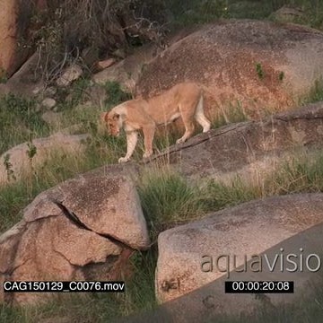 African Lioness walking on rocks looking down at cub on grass LWS PAN HAND