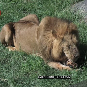 African Lion with bloody face laying down on grass and rubbing face HA MLS HAND