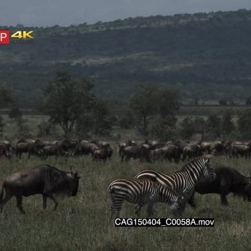Cape Mountain Zebras and Blue Wildebeest herd standing grazing and walking in the savannah WS HAND
