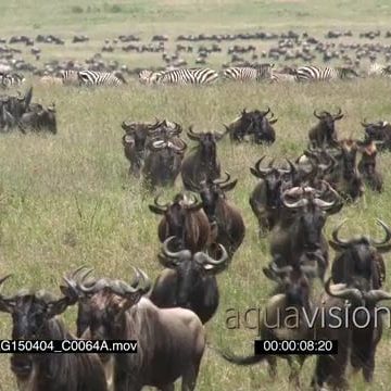 Blue Wildebeest herd running towards camera in the savannah and A Large Dazzle Zebra in background walking and grazing WS HAND