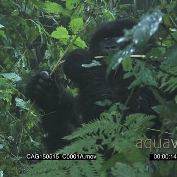 Mountain Gorilla sitting in forest Feeding on sticks and looking around MS HAND RAIN
