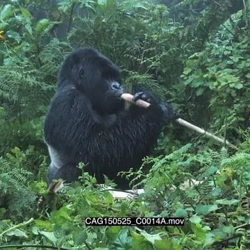 Mountain Gorilla sitting in forest eating MLS HAND