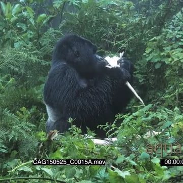 Mountain Gorilla sitting in forest eating MLS HAND