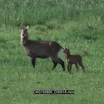 Waterbuck standing on bushveld with calf looking at camera then walking MWS PAN HAND