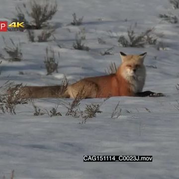 Red Fox laying down on prairie looking around Alert MWS