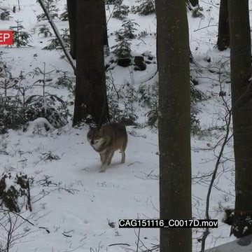 Gray Wolf walking and looking around in snowy forest HA LWS PAN
