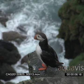 Puffin standing on a rock above ocean and looking around HA MLS