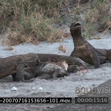 Tourists standing in river looking at Komodo Dragons pulling and feeding on a kill on riverbank MWS PAN ZI MLS HAND
