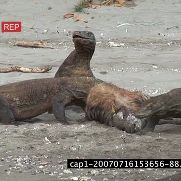 Komodo Dragons feeding on a kill moving and looking around on riverbank MWS MLS ZI ZO HAND
