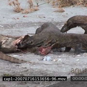 Komodo Dragons moving walking and feeding on a kill on riverbank MLS MWS ZI ZO PAN HAND