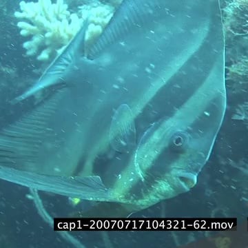 Longfin Batfish swimming and getting cleaned by Bluestreak Cleaner Wrasse underwater in ocean MLS HAND