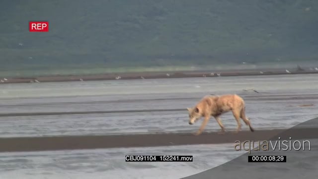 Wolf walking, hunting salmon and looks on the ground.