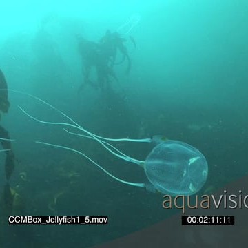 School of Box Jellyfish swimming underwater in ocean and passing by camera MLS PAN