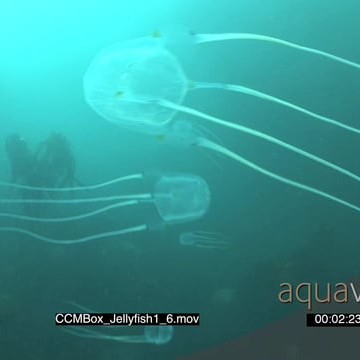 School of Box Jellyfish swimming underwater in ocean and passing by camera MLS PAN