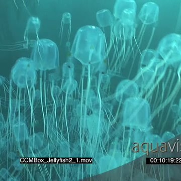 School of Box Jellyfish swimming and floating around underwater in ocean LS PAN