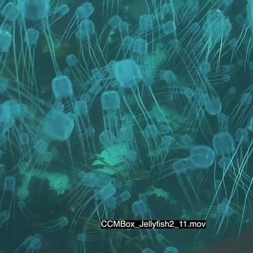 School of Box Jellyfish floating underwater in ocean HA LS PAN