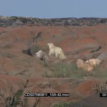 Polar bear constantly looking back alerted walking away amongst boulders after gun flair shoots fired