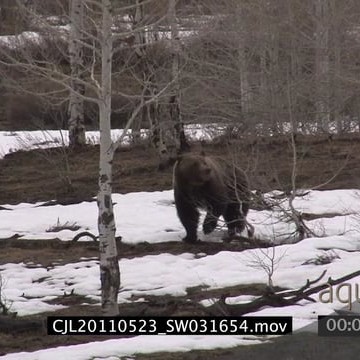 Grizzly Bear walking looking around in dry forest on snow then running away WS PAN