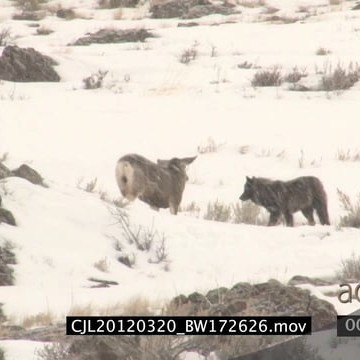 Elk Antelope and Gray Wolf standing on prairie during snow fall and intimidating one another WS