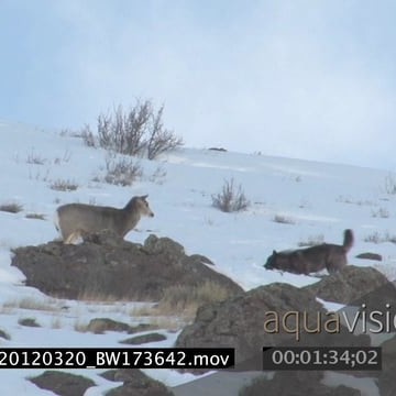 Gray Wolf running around on snowy prairie while trying to hunt Elk Antelope WS