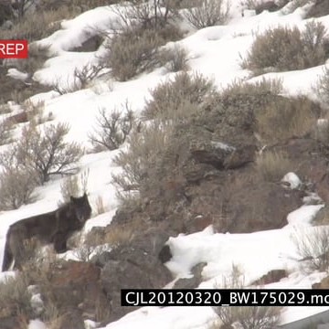 Elk Antelope and Gray Wolf walking and standing on rocky snowy prairie WS