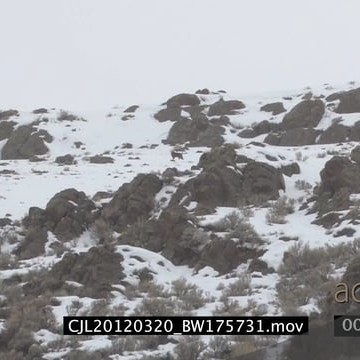 Gray Wolf walking and looking around on snowy prairie then sitting on a rock XLS ZI WS PAN