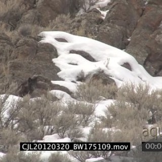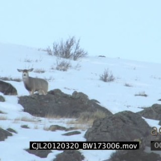Elk Antelope being hunted by Gray Wolf and wolf running around on snowy prairie WS PAN