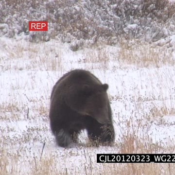 Grizzly Bear walking and looking around on snowy prairie LS PAN